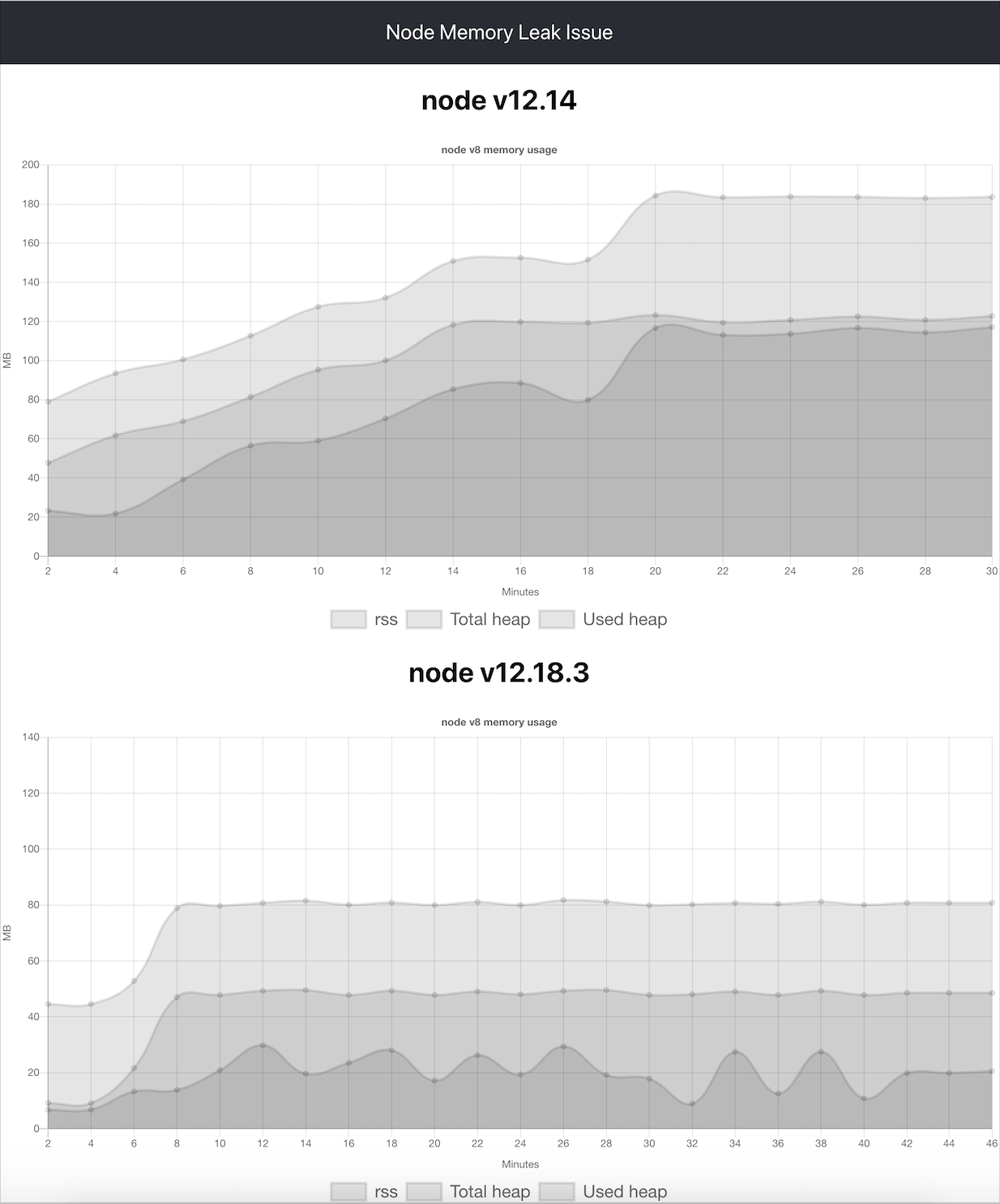 I reproduced this issue locally and here is the heap usage comparison for same code using different node versions.